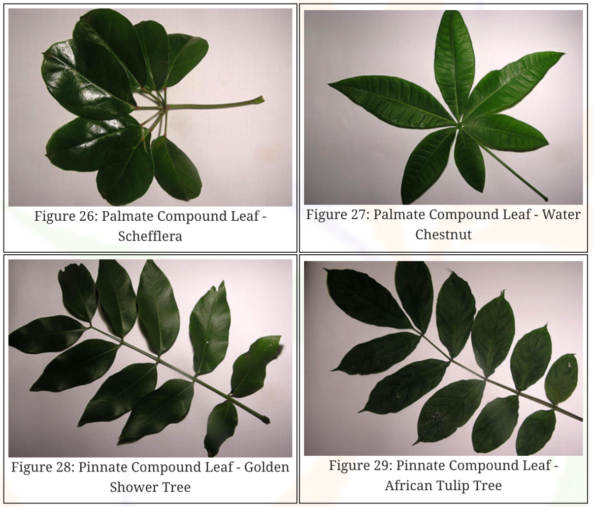Leaves may also have more than one blade attached to a petiole. The separate, smaller blades are called “leaflets”, and there may just be just a few, or many, depending on the kind of plant. The leaflets are attached to a central stalk called the rachis. How the leaflets are arranged is an important plant identification characteristic. The two most common patterns mimic the venation patterns of simple leaves, and are called palmate-compound (as in Schefflera or Octopus tree, Figure 26, and in Water Chestnut Tree, Figure 27), or pinnate-compound (as in Golden Shower Tree, Figure 28, and in African Tulip Tree, Figure 29).