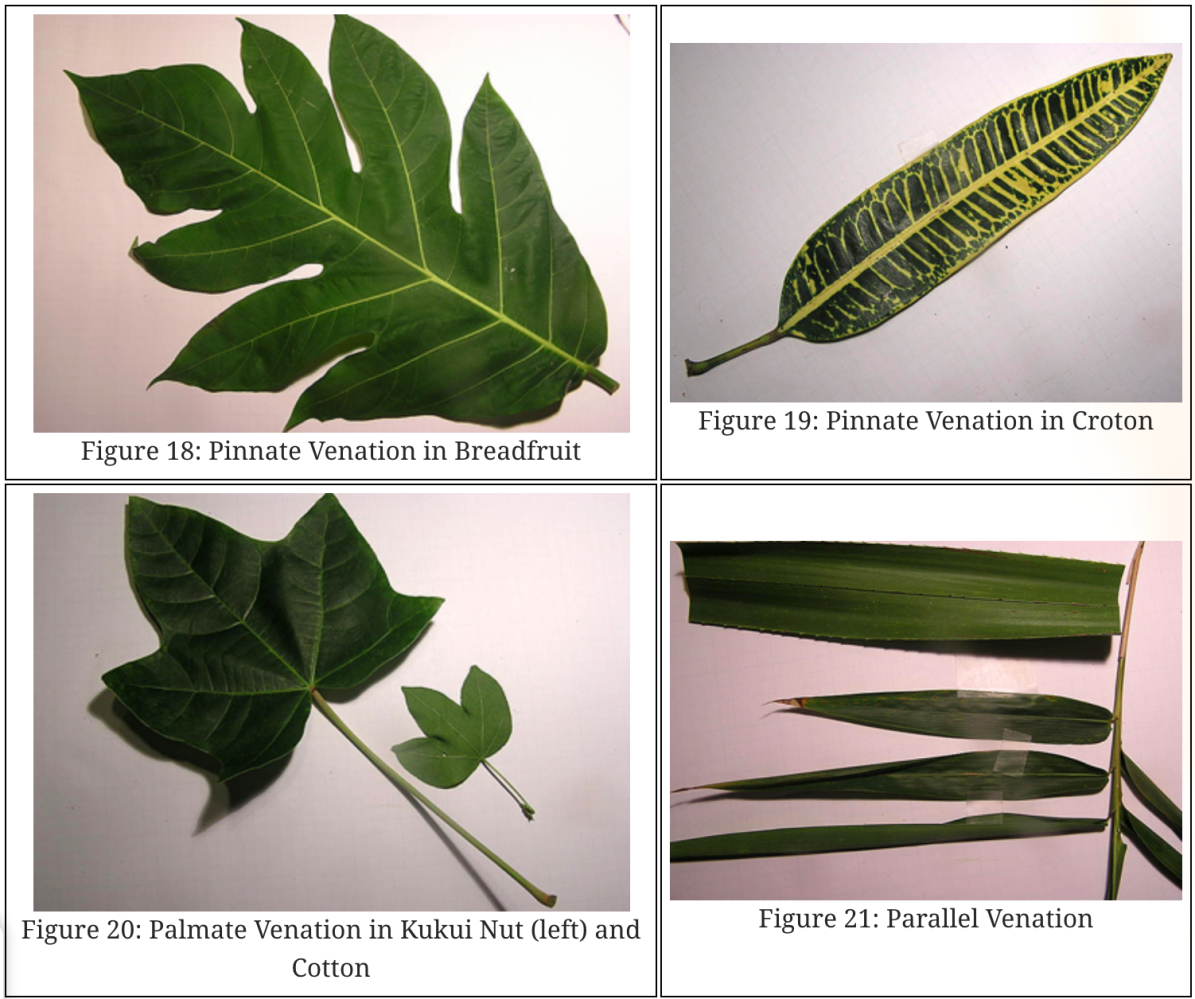 Water and mineral nutrients from the soil are moved about in the leaf blade through “veins”, which are usually in patterns characteristic of the particular plant from which the leaf was taken. Three major venation patterns in simple leaves are “palmate”, “pinnate”, or “parallel” (Figure 17, left to right).