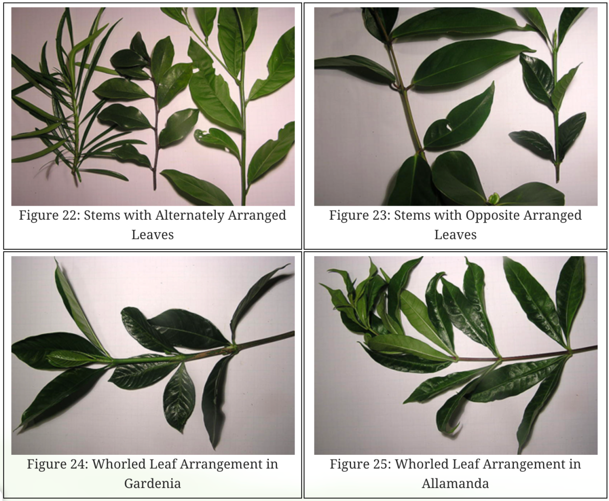 The location on the stem where the leaf is attached is called a “node”. There may be just one leaf per node—the most common—(alternate or spiral, Figure 22), or two (opposite, Figture 23), or even three or more—relatively uncommon—(whorled, Figures 24 and 25).
