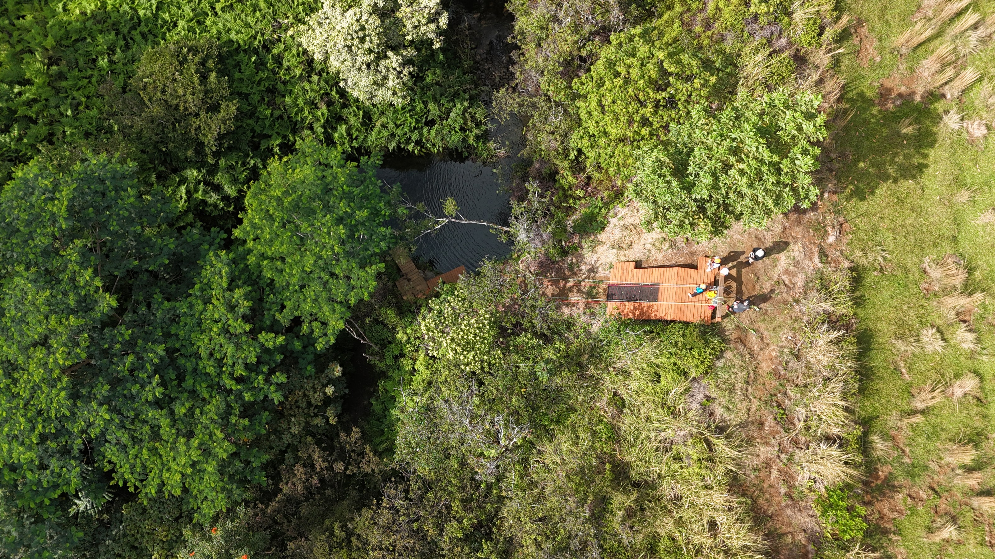 Start Area Description: The start is on an 8 x 10 foot deck under a Kakui Nut Tree. While you rappel off the top of the platform, the group will be taking pictures from the large observation deck.